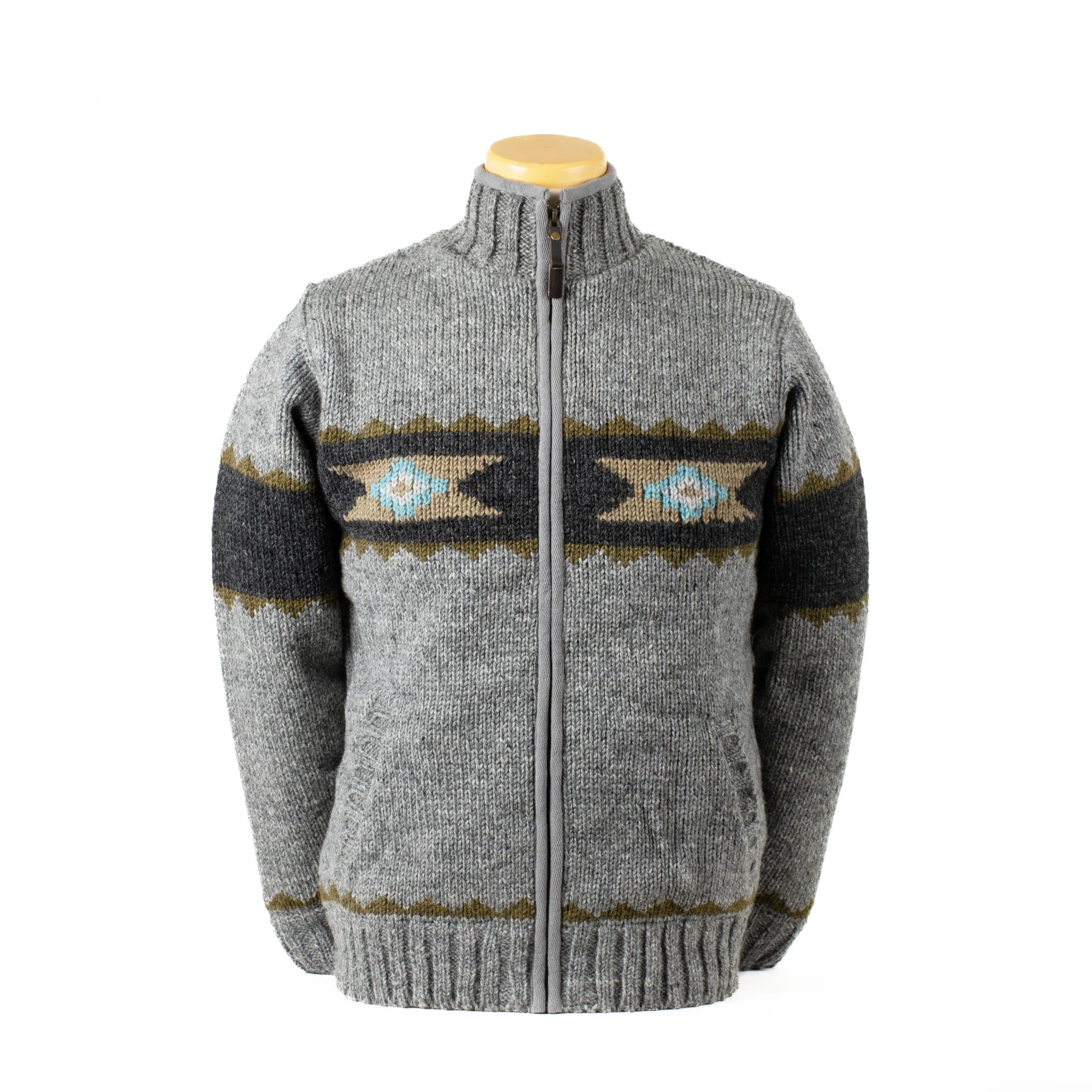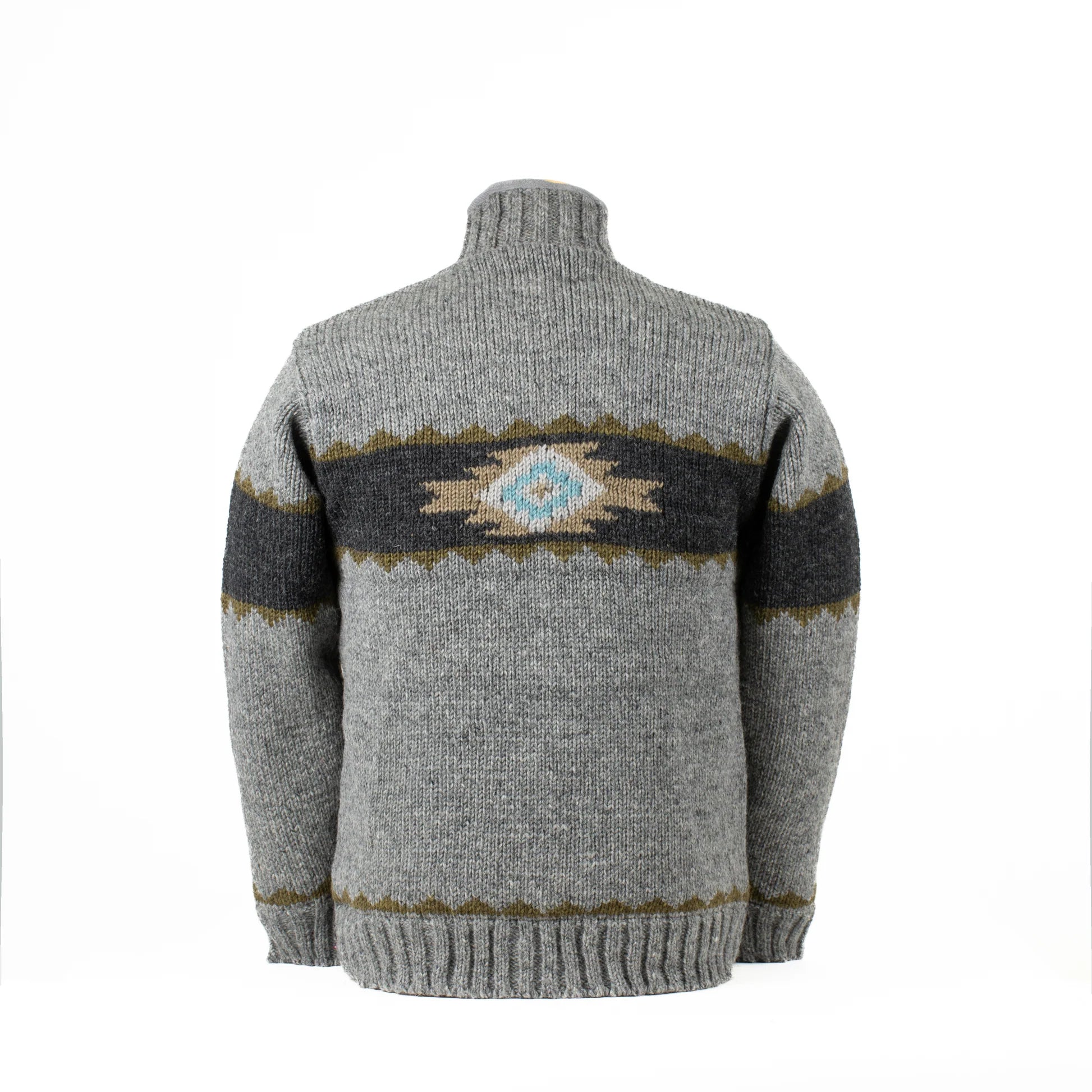 The best sweaters yet are back! From the first time we saw these, we knew they were made to be part of the Woolies collection. The Navajo is made to withstand anything winter throws at it while keeping you looking good. The timeless diamond detailing inspired by traditional Navajo patterns adorn the chest and hems, while a zipper-pull crafted from polished horn or bone adds a masculine touch. Super-thick ribbing around the cuffs and hemline locks in the warmth. This handsome piece is Finished with a stand-up collar to make pairing with your favorite hat easy.