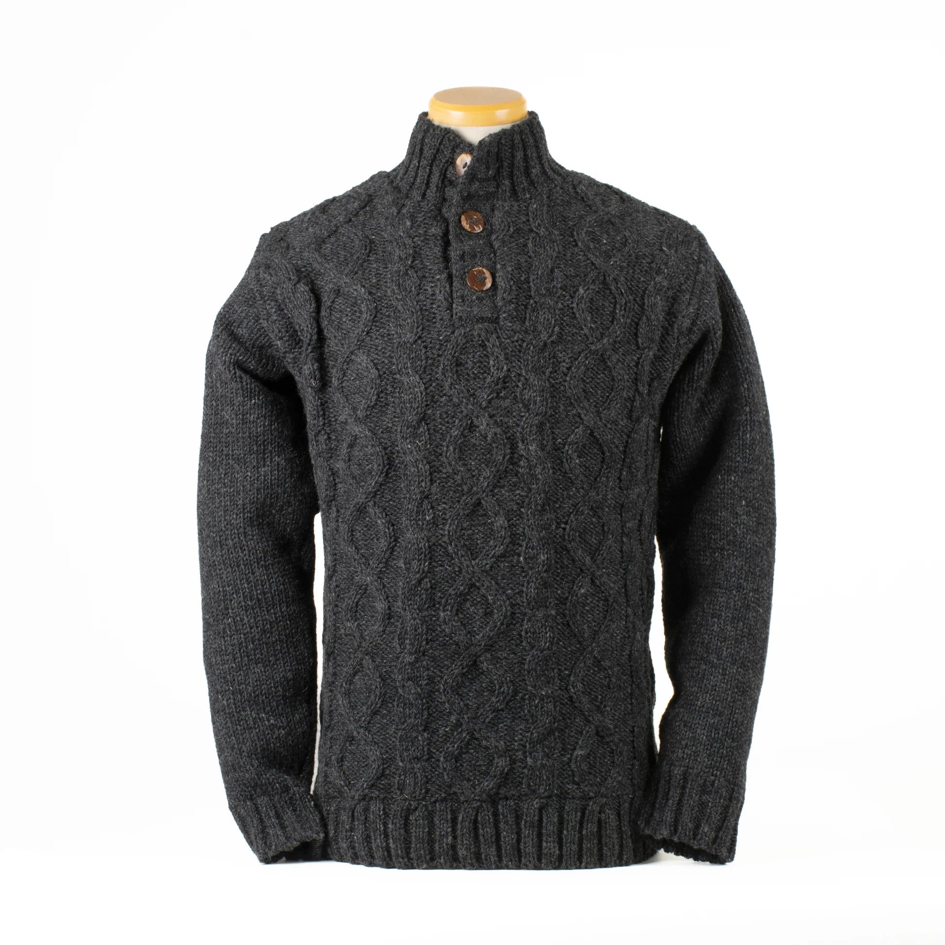 The Connery Sweater is hand-knitted by master artisans and features a bold cable pattern that pays tribute to traditional fisherman designs. The stand-up collar and elegant neck opening are accented with coconut shell buttons, adding a natural touch to this sophisticated knit. Crafted from wool and lined with soft cotton jersey, the Connery Sweater provides both warmth and comfort, perfect for layering in cooler weather. This quality knit seamlessly combines rugged style with timeless elegance.